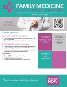 Family Medicine Lecture Series – Oral Health and Systemic Health: Barriers and Supports - Cindy Holden November 21, 20258:00 am - 9:00 am 1 hour